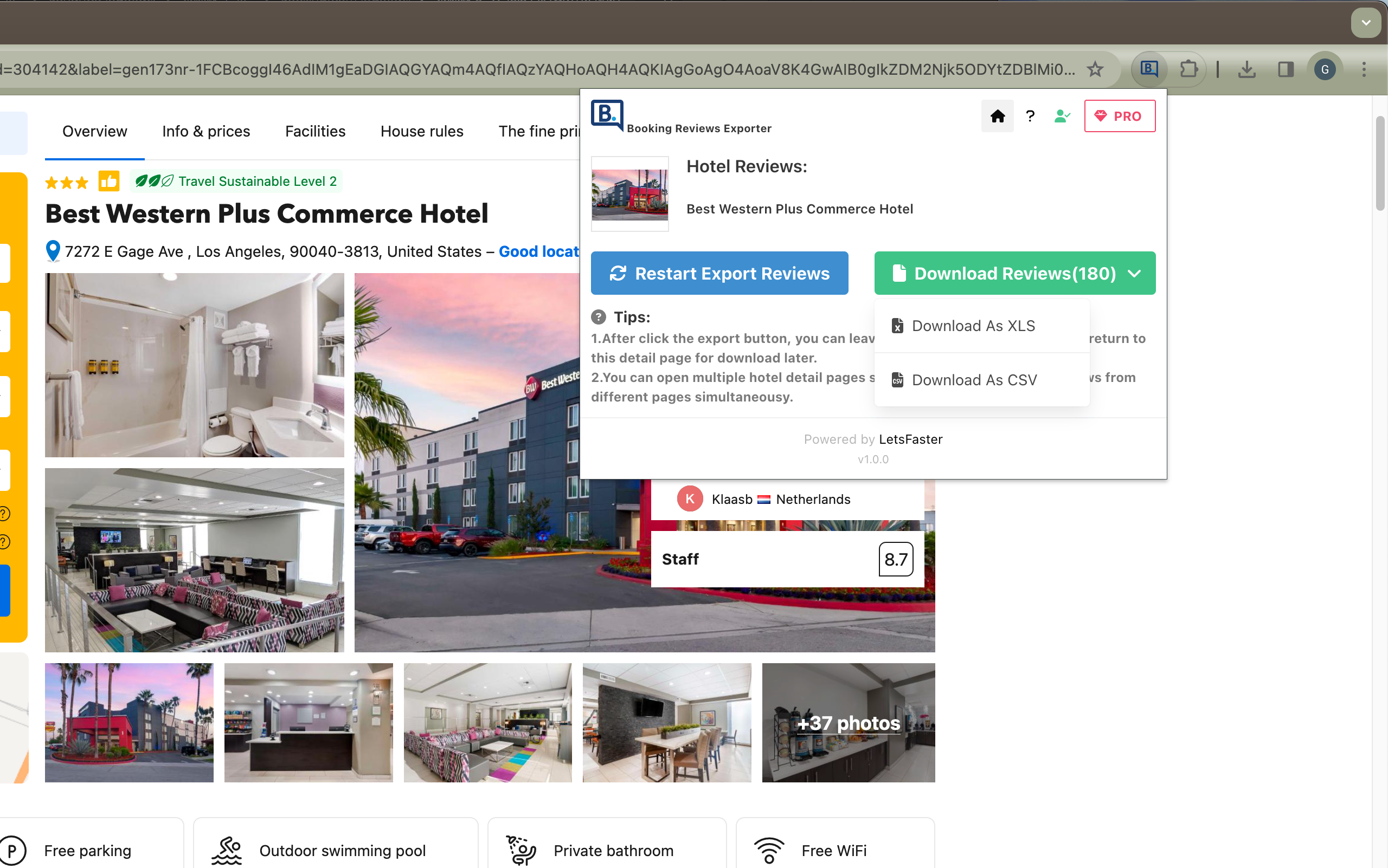 Effortlessly export Booking reviews information from the hotel detail page to a XLS/CSV file with just one click.